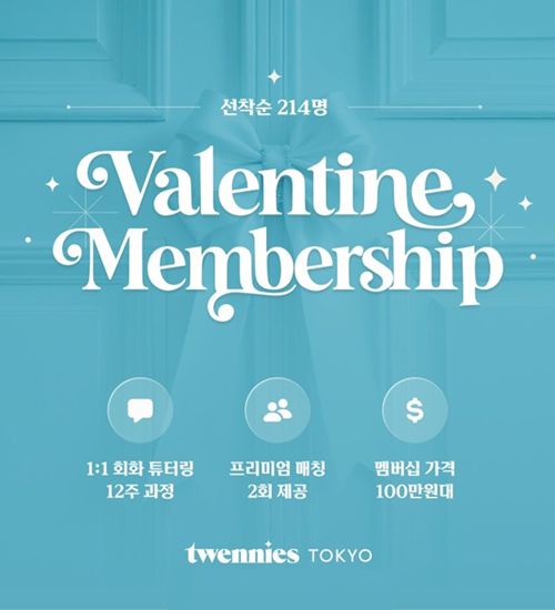 구체적으로는 지원자 중 선착순으로 214명을 선정, ‘발렌타인 멤버십’을 제공한다. 멤버십에 선정된 남성은 트웨니스 도쿄에 가입된 여성 회원 중, 일본어 교육 자격증을 갖춘 여성 회원과 12주 코스 1:1 온라인 일본어 회화 코스를 진행한다. 이 12주 과정을 마친 후에는 실제 일본인 여성 회원과 소개팅 2회를 진행할 수 있다. 멤버십 가격은 100만 원대다.