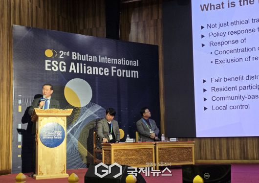 (부탄=국제뉴스) 유지현 기자 = 10일 부탄 팀푸시 부탄왕립대학교(RUB)에서 열린 제2회 부탄 국제 ESG 동맹포럼(The 2nd Bhutan International ESG Alliance Forum) '기업 탄소중립 정책대응과 경영 전략' 세션에서 황준석 한국여행업협회(KATA) 상근부회장이 '관광의 재구성: 성장에서 지속가능·공정 관광으로(Rethinking Tourism: From Growth to Sustainable and Fair Tourism)'를 주제로 발표했다.