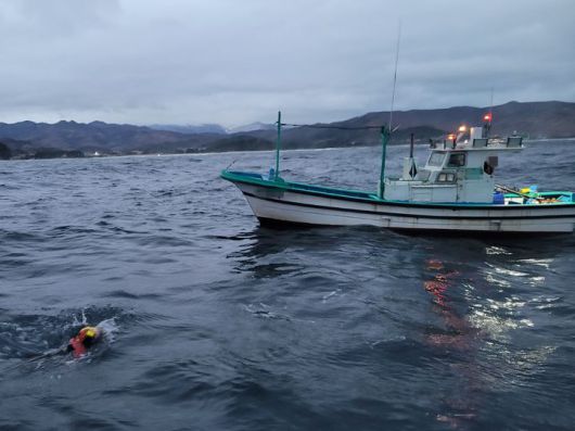 [동해=뉴시스] 19일 동해해양특수구조대 잠수사가 스크루에 부유물이 감겨 항해가 불기능한 어선으로 다가가고 있다.(사진=동해해경 제공)photo@newsis.com *재판매 및 DB 금지 |