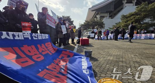 (천안=뉴스1) 이시우 = 독립기념관 이사회가 열리는 밝은누리관 앞에서 독립운동가 후손과 시민단체 회원들의 김형석 관장 해임 촉구 집회(왼쪽)를, 자유민주공동체 수호연합 회원들이 김형석 관장을 지지 집회(오른쪽)를 하고 있다. 2026.1.19/뉴스1presskt@news1.krCopyright ⓒ 뉴스1. All rights reserved. 무단 전재 및 재배포, AI학습 이용 금지.