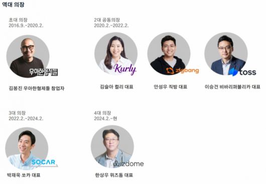 1대 의장은 김봉진 우아한형제들(배달의민족) 의장, 2대 의장은 김슬아 컬리 대표, 안성우 직방 대표, 이승건 비바리퍼블리카(토스) 대표가 공동으로 맡았으며 3대 의장은 박재욱 쏘카 대표가 역임했다. 한상우 의장은 2024년 2월 4대 의장에 취임해 임기를 시작했다.