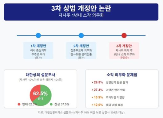 재계 관계자는 "자사주 의무 소각 법안이 통과되면 자기주식을 활용한 경영권 방어가 불가능해져 이사회 기능과 역할을 위축시킬 우려가 있어 추가 입법을 통해 보완할 필요가 있다"며 "올해 시행될 노란봉투법과 상법 개정안으로 노사 관계를 비롯한 산업 현장에 혼란이 가중될 수 있다는 우려가 크다"고 지적했다.