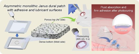 반면, 양승윤 교수 연구팀이 개발한 ‘경막봉합용 광경화 듀라 실란트’는 윤활성과 생체적합성이 우수한 ‘광가교 히알루론산(HAMA-PA)’을 기반으로 동결건조 패치 형태로 제조된다. 젖은 조직 환경에서도 체액 흡수를 통해 빠르게 조직에 밀착되고, 광경화 이후 한쪽 면은 강한 접착력을 또 다른 면은 윤활성을 띄는 ‘야누스’ 표면 특성을 가진다. 저출력 가시광을 이용하기 때문에 5초 이내 신속한 봉합이 가능해 수술 시간을 획기적으로 단축할 수 있으며, 체내에서 팽윤이 발생하더라도 무게는 0.1g 이하 수준에서 증가돼 후유증을 최소화할 수 있다는 장점이 있다.