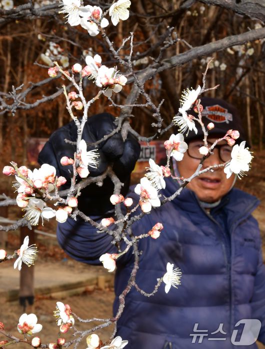 (포항=뉴스1) 최창호 기자 = 일년 가운데 가장 춥다는 대한(大寒)을 하루 앞둔 19일 오후 경북 포항시 남구 포항시청 뒷편 야산에 매화가 꽃망울을 활짝 터뜨리고 있다. 2026.1.19/뉴스1