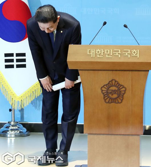 (서울=국제뉴스) 김병기 더불어민주당 의원이 19일 서울 여의도 국회 소통관에서 기자회견을 하던 중 고개숙여 인사하고 있다./사진=이용우 기자