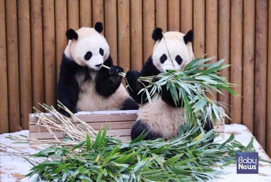 에버랜드, 눈 덮인 '판다 세컨하우스'에서 즐거운 시간을 보내는 루이바오(우)와 후이바오(좌). ⓒ에버랜드 |