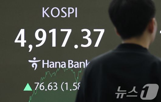 (서울=뉴스1) 박지혜 기자 = 코스피가 장중 사상 첫 4900선을 돌파한 19일 서울 중구 하나은행 본점 딜링룸 전광판에 코스피 지수가 나타나고 있다. 이날 코스피는 장중 4917.37까지 올라 신고가를 경신했다. 2026.1.19/뉴스1pjh2580@news1.krCopyright ⓒ 뉴스1. All rights reserved. 무단 전재 및 재배포, AI학습 이용 금지.