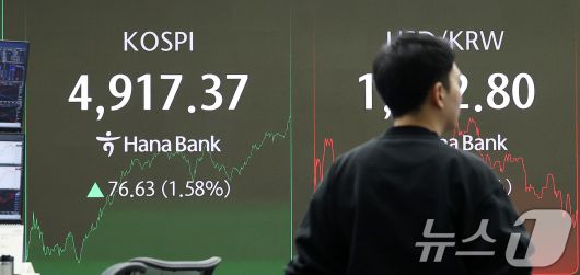 (서울=뉴스1) 박지혜 기자 = 코스피가 장중 사상 첫 4900선을 돌파한 19일 서울 중구 하나은행 본점 딜링룸 전광판에 코스피 지수가 나타나고 있다. 이날 코스피는 장중 4917.37까지 올라 신고가를 경신했다. 2026.1.19/뉴스1