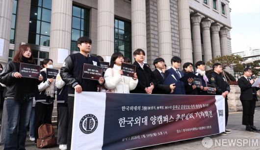 [서울=뉴스핌] 양윤모 기자 = 한국외국어대학교 총학생회 학생들이 19일 오후 서울 동대문구 이문동 한국외국어대학교 서울캠퍼스 본관 앞에서 학교 측이 제시한 3.19%의 등록금 인상안에 항의 기자회견을 하고 있다. 2026.01.19 yym58@newspim.com