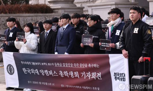 [서울=뉴스핌] 양윤모 기자 = 한국외국어대학교 총학생회 학생들이 19일 오후 서울 동대문구 이문동 한국외국어대학교 서울캠퍼스 본관 앞에서 학교 측이 제시한 3.19%의 등록금 인상안에 항의 기자회견을 하고 있다. 2026.01.19  yym58@newspim.com