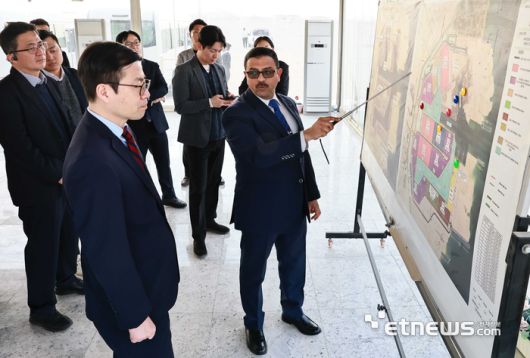 여한구 산업통상부 통상교섭본부장이 18일(현지시간) 이집트 수에즈특구내 소크나 산업단지와 연계된 수출항(소크나 항만)을 방문해 설명을 듣고 있다. 산업부 제공 |