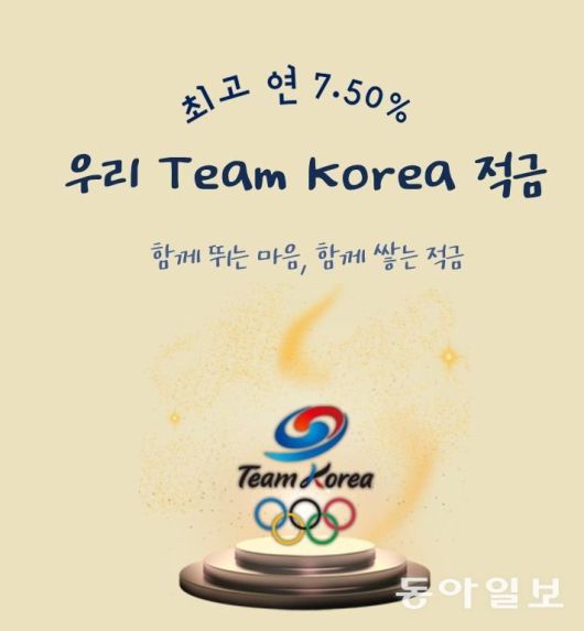 우리은행이 최고 연 7.5%의 금리를 제공하는 ‘우리 팀 코리아 적금’을 선보였다. 우리금융그룹의 대한체육회 공식 파트너 선정을 기념하고 다음 달 6일 열리는 밀라노·코르티나담페초 동계올림픽에 출전하는 국가대표 선수단을 응원하기 위한 상품이다. 기본 금리는 연 2.5%로, 올림픽 국가대표 선수가 금메달을 획득하면 0.5%포인트(은메달, 동메달은 각각 0.2%포인트, 0.1%포인트) 등 최대 5%포인트의 우대금리를 받을 수 있다. 1인 1계좌, 월 최대 30만 원까지 납입 가능한 12개월 만기 자유적립식 상품으로, 총 10만 좌 한도로 판매한다.