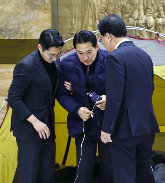 통일교·공천헌금 '쌍특검'을 요구하며 닷새째 단식을 진행 중인 장동혁 국민의힘 대표가 19일 오후 서울 여의도 국회 로텐더홀에서 송언석 원내대표와 박준태 당대표 비서실장의 부축을 받으며 이동하고 있다. 뉴시스 |