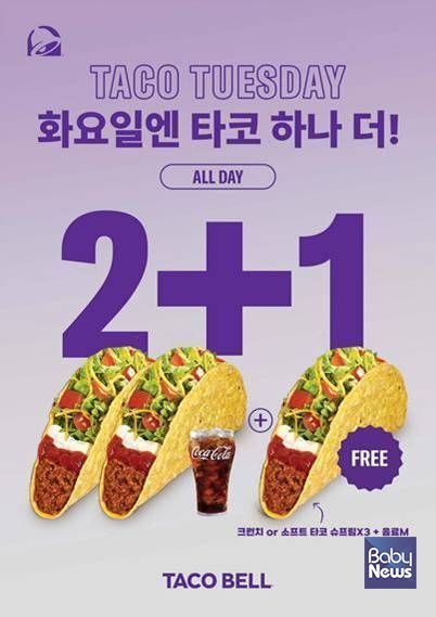 이에 타코벨코리아도 매주 화요일 정기 프로모션을 운영하며, 시간대별로 차별화된 혜택을 선보인다. 화요일 전 시간대(오전 10시~오후 10시)에는 크런치 또는 소프트 타코 슈프림 2개와 음료(M) 세트를 구매하면, 1만 원에 타코 슈프림 1개를 추가로 제공하는 2+1 혜택을 마련했다. 또한 오후 8시부터 10시까지는 크리스피 치킨 타코 1개와 음료(M) 세트를 구매하면, 6,300원에 크리스피 치킨 타코 1개를 추가로 제공하는 1+1 혜택을 운영한다.