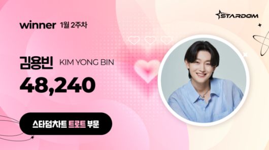 한편 김용빈은 26년 1월 2주차 '스타덤 차트' 음원 부문에서도 '어제도 너였고 오늘도 너여서'로 1위를 기록하면서 17주 연속 정상을 지켰다. 배우 부문 주간랭킹에서는 김수현이 14주 연속 1위에 올랐다. 아이돌 부문에서는 아홉이 1위를 차지했다.