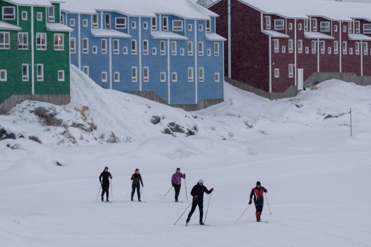 18일 그린란드 누크의 얼어붙은 호수에서 스키를 타는 사람들. /연합뉴스 |