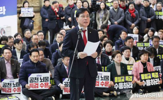 [서울=뉴스핌] 윤창빈 기자 = 송언석 국민의힘 원내대표가 19일 서울 여의도 국회 로텐더홀에서 열린 통일교 게이트·더불어민주당 공천뇌물 특검 촉구 규탄대회에서 규탄사를 하고 있다. 2026.01.19 pangbin@newspim.com