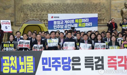 [서울=뉴스핌] 윤창빈 기자 = 장동혁 국민의힘 대표, 송언석 원내대표를 비롯한 소속 의원들이 19일 서울 여의도 국회 로텐더홀에서 통일교 게이트·더불어민주당 공천뇌물 특검 촉구 규탄대회를 열고 구호를 외치고 있다. 2026.01.19 pangbin@newspim.com
