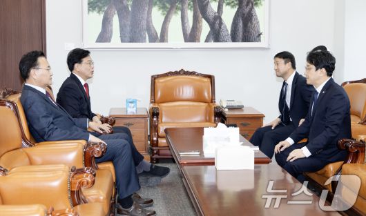 (서울=뉴스1) 이승배 기자 = 19일 서울 여의도 국회에서 한병도 더불어민주당 원내대표, 천준호 원내수석, 송언석 국민의힘 원내대표, 유상범 원내수석이 회동하고 있다. 2026.1.19/뉴스1photolee@news1.krCopyright ⓒ 뉴스1. All rights reserved. 무단 전재 및 재배포, AI학습 이용 금지.