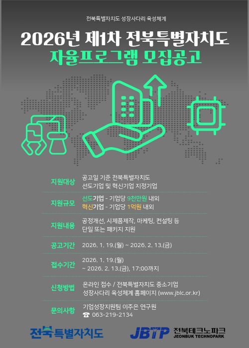 전북테크노파크(원장 이규택)는 유망 중소기업의 도약과 지역 경제 활성화를 위해 '2026년 전북특별자치도 선도기업 및 혁신기업 지원사업' 참여 기업을 통합 모집한다고 19일 밝혔다.