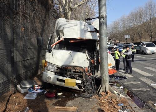 (인천=연합뉴스) 최은지 기자 = 19일 오후 1시 30분께 인천시 남동구 만수동 영동고속도로 인근 4차로에서 30대 남성 A씨가 몰던 4.5t 화물차가 신호등을 들이받았다.