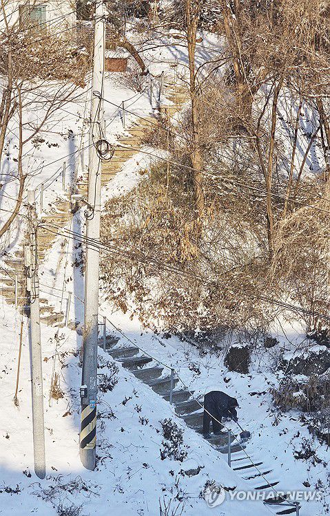 (춘천=연합뉴스) 이재현 기자 = 절기상 대한을 하루 앞둔 19일 강원 춘천시 삼천동 인근에서 한 노인이 집을 오르내리는 가파른 계단에 쌓인 눈을 치우고 있다. 2026.1.19