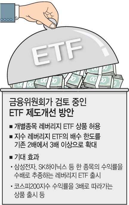 금융위는 개별종목 레버리지 ETF 상품 허용과 지수 레버리지 ETF의 배수 한도를 기존 2배에서 더 확대하는 방안 등을 검토 중인 것으로 알려졌다. 현재 국내에서는 개별 종목의 수익률을 수배로 추종하거나 특정 지수 수익률을 2배 이상으로 따라가는 ETF 상품은 나올 수 없도록 규제하고 있다.