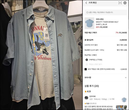무신사 스토어 강남에서 판매 중인 한 상품(왼쪽)과 온라인 무신사 앱의 같은 상품 상세 페이지. 상품마다 부착된 QR코드를 스마트폰 카메라로 조회하면 자동으로 무신사 앱이 켜지고 제품 상세 페이지로 이동한다. /정재훤 기자 |