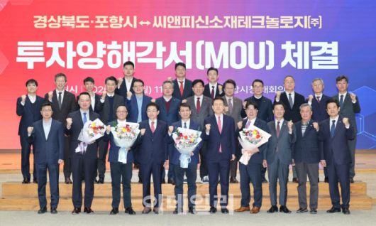 경북도와 포항시는 19일 포항시청에서 씨앤피신소재테크놀로지와 5000억원 규모의 투자양해각서(MOU)를 체결했다고 밝혔다. 이번 MOU에 따라 회사측은 2030년까지 포항 영일만4일반산업단지 내 4만 5198㎡ 부지에 에너지저장장치(ESS) 및 전기자동차용 LFP 양극재 생산설비 구축에 5000억원을 투자할 계획이다.