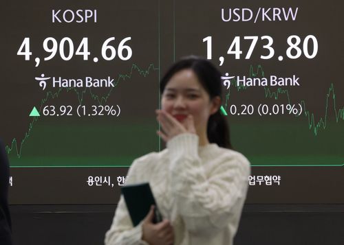코스피 계속 상승 (서울=연합뉴스) 류영석 기자 = 코스피가 전장보다 63.92p(1.32%) 오른 4,904.66으로 마감한 19일 서울 중구 하나은행 딜링룸에서 딜러가 업무를 보고 있다. 2026.1.19 ondol@yna.co.kr (끝) <저작권자(c) 연합뉴스, 무단 전재-재배포, AI 학습 및 활용 금지> |