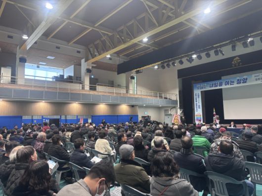 김돈곤 청양군수가 청양문화센터에서 주민들에게 군정 성과와 향후 비전을 설명하고 있다./청양군 |