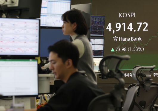 코스피 지수는 19일 장중 4917포인트를 넘어 사상 최고치를 기록했다. 서울 중구 하나은행 딜링룸에서 딜러가 업무를 보고 있다./연합뉴스 |