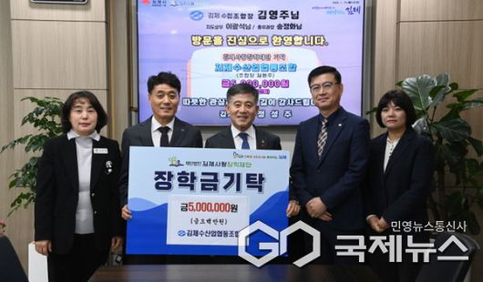 (김제=국제뉴스) 조광엽 기자 = 김제사랑장학재단이 19일, 수산업협동조합(조합장 김영주)과 새만금장례식장(대표 김덕운)이 지역 인재 육성을 위한 장학금으로 각 500만 원과 300만 원을 기탁했다.
