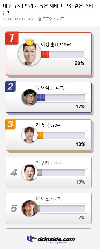 커뮤니티 포털사이트 디시인사이드가 ‘내 돈 관리 맡기고 싶은 재태크 고수 같은 스타는?’이란 주제로 튜표한 결과 서장훈이 1528표를 얻어 1위를 차지했다고 19일 밝혔다.