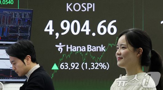 (서울=뉴스1) 박지혜 기자 = 코스피가 장중 사상 첫 4900선을 돌파한 19일 서울 중구 하나은행 본점 딜링룸 전광판에 종가 현황이 나타나고 있다. 이날 코스피는 전장보다 63.92포인트(1.32%) 오른 4,904.66에 장을 마치며 종가 기준 사상 최고치를 또 경신했다. 2026.1.19/뉴스1