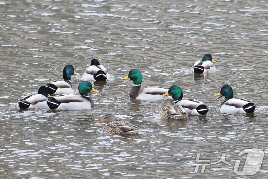 (청도=뉴스1) 공정식 기자 = 19일 오후 경북 청도군 화양읍 청도천에서 청둥오리가 무리를 지어 유영하고 있다. 기상청은 20일 전국 대부분 지역의 아침 기온이 크게 낮아지고, 내륙·산간을 중심으로 영하 10도 안팎의 매서운 한파가 이어질 것으로 내다봤다. 2026.1.19/뉴스1