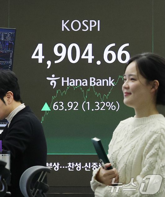 (서울=뉴스1) 박지혜 기자 = 코스피가 장중 사상 첫 4900선을 돌파한 19일 서울 중구 하나은행 본점 딜링룸 전광판에 종가 현황이 나타나고 있다. 이날 코스피는 전장보다 63.92포인트(1.32%) 오른 4,904.66에 장을 마치며 종가 기준 사상 최고치를 또 경신했다. 2026.1.19/뉴스1