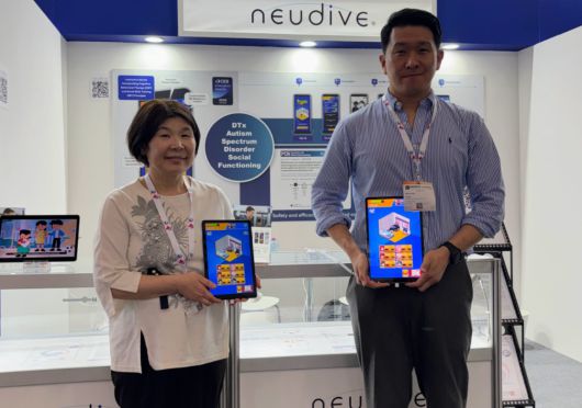 세계 최대 의료기기 박람회 ‘MEDICA 2025’ 현장에서 뉴다이브 조성자 대표(왼쪽)와 한국뇌연구원 정민영 선임연구원(오른쪽)이 자폐스펙트럼장애(ASD) 디지털 인지행동 치료기기를 선보이고 있다.[한국뇌연구원 제공] |