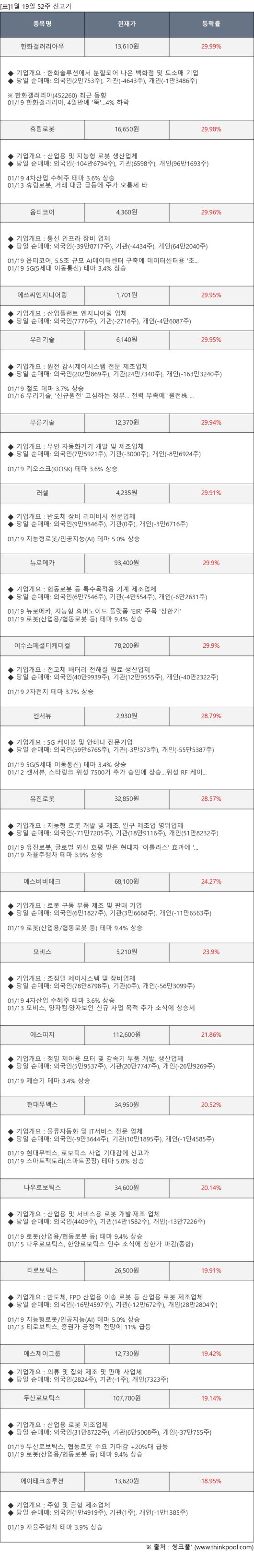 [서울=뉴스핌] 로보뉴스 = 1월 19일, 인공지능 투자비서 ‘AI라씨로’가 한화갤러리아우(45226K), 휴림로봇(090710) 등 52주 신고가가 발생한 종목들에 대한 최근 동향을 분석했다.