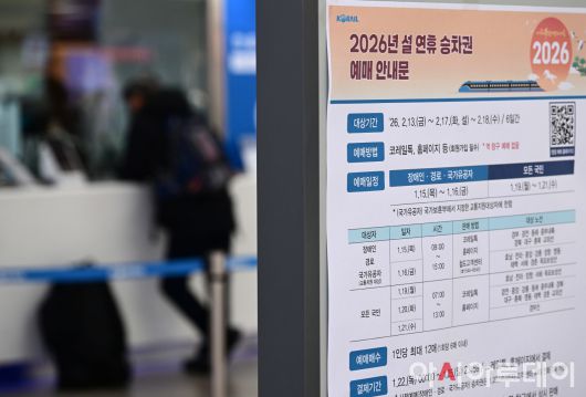 아시아투데이 이병화 기자 = 전국민 대상 설 연휴 열차 승차권 일반 예매가 시작된 19일 서울 중구 서울역 승차권 판매창구 앞에 관련 안내문이 게시되어 있다. 설 연휴 승차권 일반 예매는 오늘부터 21일까지 사흘간 오전 7시부터 오후 1시까지 코레일톡과 공식 홈페이지를 통해 예매할 수 있다.