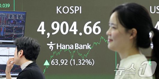 (서울=뉴스1) 박지혜 기자 = 코스피가 장중 사상 첫 4900선을 돌파한 19일 서울 중구 하나은행 본점 딜링룸 전광판에 종가 현황이 나타나고 있다. 이날 코스피는 전장보다 63.92포인트(1.32%) 오른 4,904.66에 장을 마치며 종가 기준 사상 최고치를 또 경신했다. 2026.1.19/뉴스1