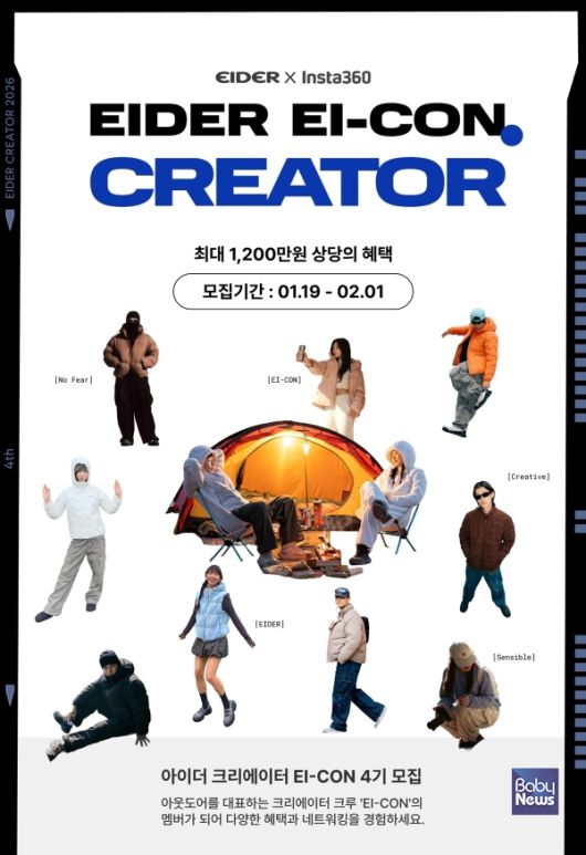 모집 기간은 1월 19일(월)부터 2월 1일(일)까지이며, 총 20팀의 아웃도어·라이프스타일·AI 활용 크리에이터를 선발한다. 지원은 네이버 포털에 '아이더’를 검색한 후 '크리에이터 모집’ 페이지를 통해 가능하다. 인스타그램 및 유튜브에서 활동 중이며 월별 미션을 성실하게 수행할 수 있고, 2월 13일 발대식과 6월 20-21일 예정된 해단식에 참석 가능한 이들이라면 누구나 지원할 수 있다.