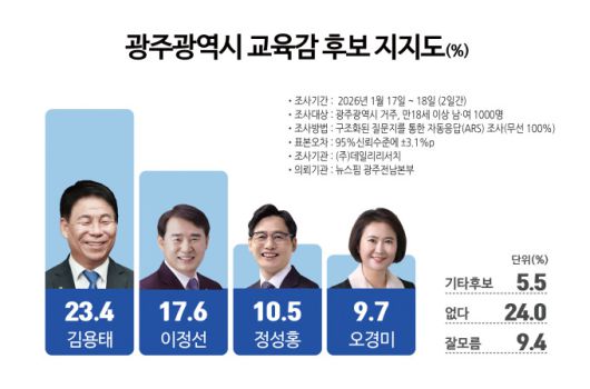 <뉴스핌 광주·전남취재본부>가 여론조사 전문기관 데일리리서치에 의뢰해 지난 17~18일 이틀간 광주지역에 거주하는 만 18세 이상 남녀 1000명을 대상으로 실시한 광주시교육감 후보 지지도 여론조사에서 김용태 전 학교장이 23.4%의 지지를 얻었고 현직 프리미엄을 안고 있는 이정선 광주시교육감은 17.6%를 얻어 오차 범위 내 양강 구도를 형성했다.