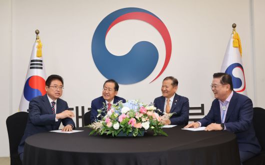 이철우 경북도지사(왼쪽)와 홍준표 전 대구시장(왼쪽 두번째)이 2024년 6월 서울 종로구 정부서울청사에서 열린 대구·경북 행정통합 관계기관 간담회에 참석하고 있다. 행정안전부 제공 |