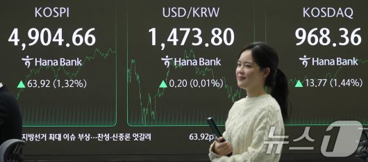 (서울=뉴스1) 박지혜 기자 = 코스피가 장중 사상 첫 4900선을 돌파한 19일 서울 중구 하나은행 본점 딜링룸 전광판에 종가 현황이 나타나고 있다. 이날 코스피는 전장보다 63.92포인트(1.32%) 오른 4,904.66에 장을 마치며 종가 기준 사상 최고치를 또 경신했다. 코스닥지수는 전 거래일 보다 1.44%( 13.77포인트) 상승한 968.36으로 마감했다. 2026.1.19/뉴스1