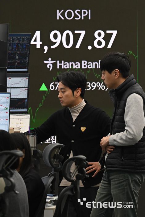 코스피 지수가 사상 최초로 장중 4900선을 돌파했다. 새해 들어 하루도 빠짐없이 오르며 12거래일 연속 사상 최고치를 새로 쓰고 있다. 19일 서울 중구 하나은행 딜링룸에서 딜러가 업무를 보고 있다. 이동근기자 foto@etnews.com [Copyright © 전자신문. 무단전재-재배포금지]