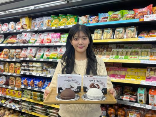 GS25에서 모델이 ‘흑·백 크림 케이크 2종’을 선보이고 있다. /사진제공=GS리테일 |