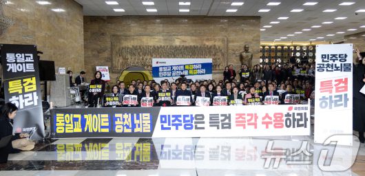(서울=뉴스1) 이승배 기자 = 장동혁 국민의힘 대표, 송언석 원내대표를 비롯한 의원들이 19일 서울 여의도 국회 로텐더홀에서 열린 통일교 게이트·더불어민주당 공천뇌물 특검 촉구 규탄대회에서 구호를 외치고 있다. 2026.1.19/뉴스1photolee@news1.krCopyright ⓒ 뉴스1. All rights reserved. 무단 전재 및 재배포, AI학습 이용 금지.