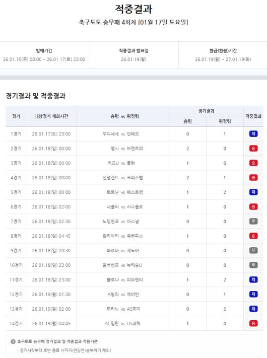 축구토토 승무패 4회차에서 선정된 14경기의 결과는 승(홈팀 승) 6경기, 무(무승부) 3경기, 패(원정팀 승) 5경기로 나타났다. 토트넘-웨스트햄(5경기), 애스턴 빌라-에버턴(12경기), 토리노-AS로마(13경기) 등 원정팀 승리 결과가 다수 포함되며, 회차 전반의 예측 난이도가 한층 높아진 것으로 분석됐다.