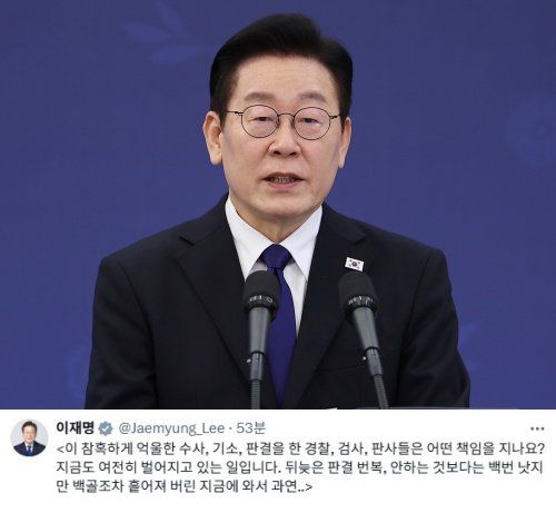 이 대통령은 이날 엑스(X·옛 트위터)에 관련 기사를 공유하면서 “지금도 여전히 벌어지고 있는 일이다. 뒤늦은 판결 번복, 안 하는 것보다는 백번 낫지만 백골조차 흩어져 버린 지금에 와서 과연”이라며 이같이 적었다.
